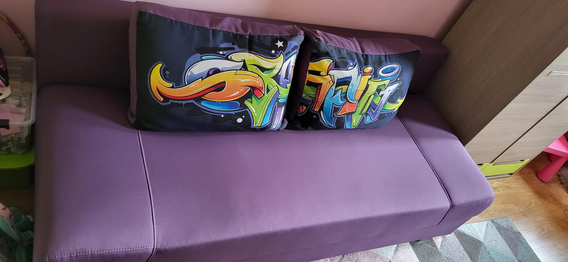 Wygodna, rozkładana kanapa w fioletowym kolorze. Na poduszkach widoczne są kolorowe graffiti, nadające meblowi ciekawego, miejskiego stylu. Łóżko jest używane, ale w bardzo dobrym stanie. Po rozłożeniu 140x195.